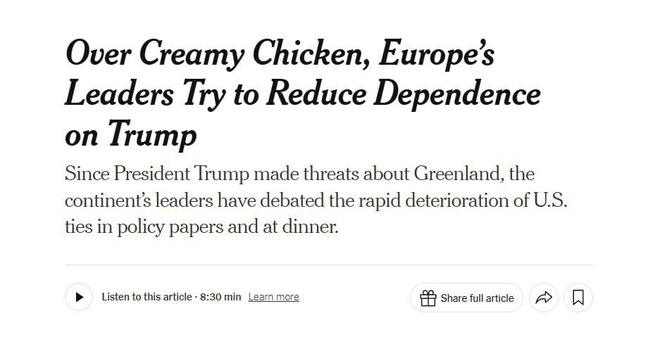 "План европейских лидеров состоит в том, чтобы сохранять спокойствие во время будущих провокаций Трампа, угрожать ответными пошлинами и, по словам чиновников, работать за кулисами над тем, чтобы сделать Европу менее зависимой в военном и экономическом отношении от своего все более ненадежного союзника", - говорится в материале.