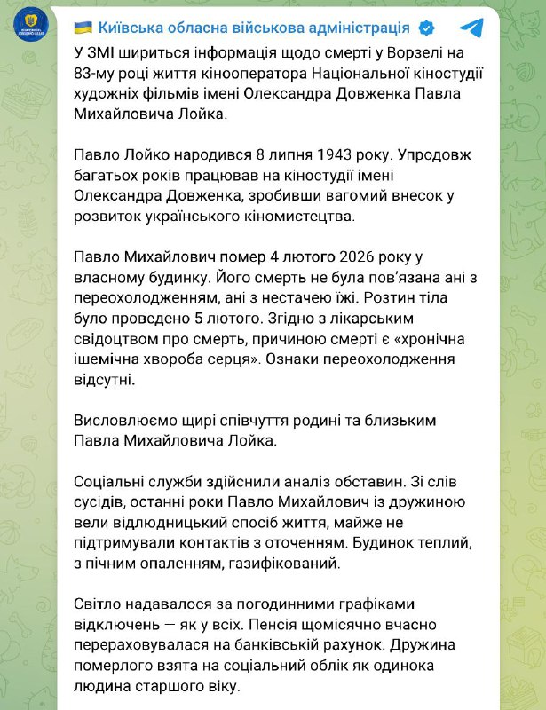 "Лойко Павел Михайлович родился 8 июля 1943 года. Высшее образование, кинематографическое. Окончил ВГИК и долгое время работал на киностудии имени А. Довженко. Работал кинооператором и участвовал в съемках многих фильмов, в том числе "Пропавшая грамота" по произведениям Н. Гоголя. Добрый, порядочный, светлый человек, способствовавший развитию украинского кинематографа. Проживал в Ворзеле с 1990-х годов. Умер 4 февраля 2026 года", - сказано в публикации Поклад.