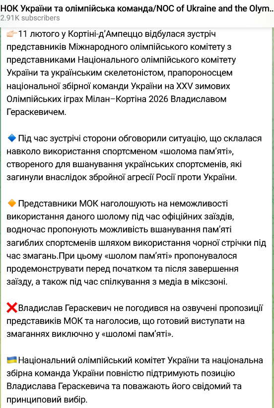 В свою очередь Национальный олимпийский комитет Украины сообщил, что Владислав Гераскевич не согласился с озвученными предложениями представителей МОК и подчеркнул, что готов выступать на соревнованиях исключительно в "шлеме памяти".