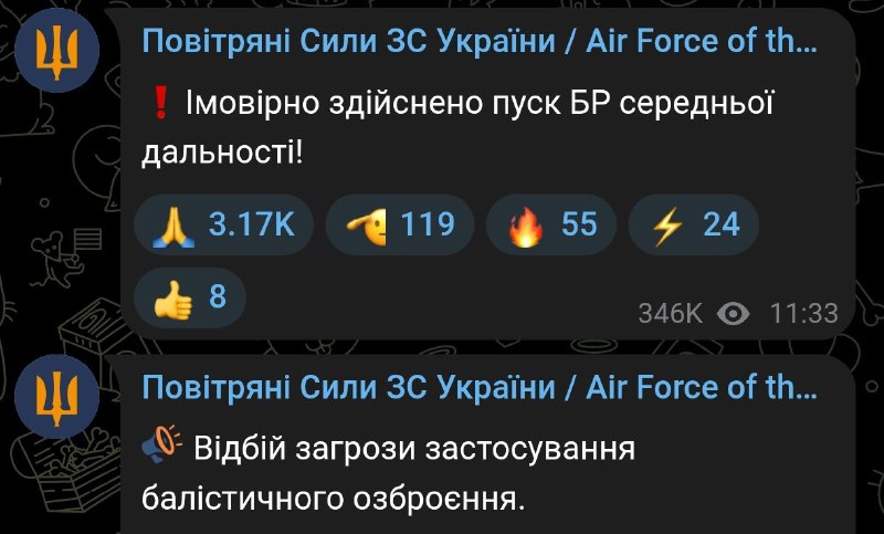 12:48 Воздушные силы дали отбой угрозы ударов ракетами средней дальности.