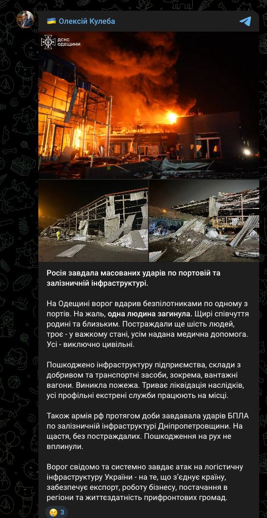 08:13 В Одесской области в результате атаки дронов на порт погиб человек, еще шестеро получили ранения, сообщил вице-премьер Кулеба.