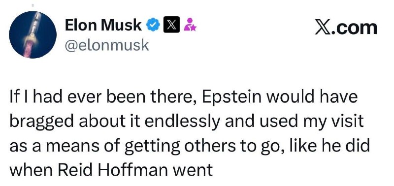 "Если бы я когда-либо там был, Эпштейн этим бесконечно хвастался бы и использовал мой визит как способ побудить других приезжать, как он сделал, когда туда приехал Рид Хоффман (сооснователь сервиса LinkedIn - Ред.)", - заявил Маск.