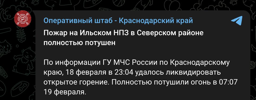 08:51 В России двое суток тушили пожар на Ильском НПЗ, сообщает оперативный штаб Краснодарского края.