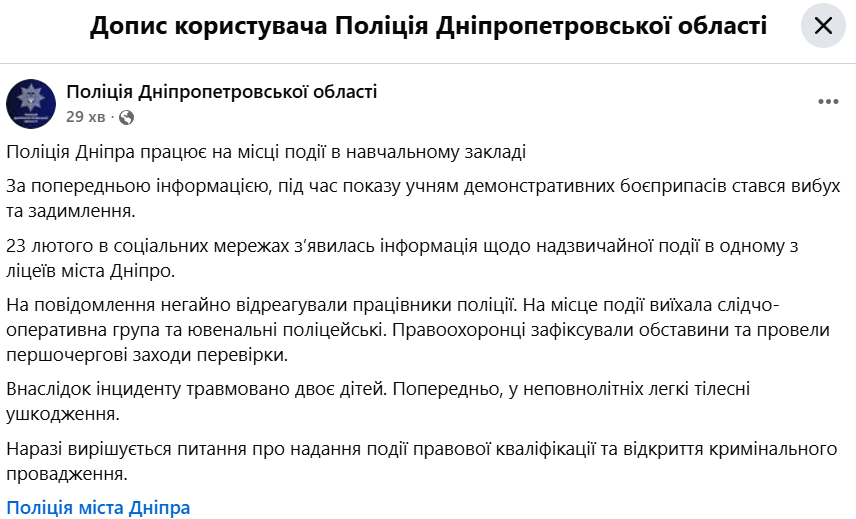В лицее №137 Днепра произошел взрыв во время демонстрации школьникам боеприпасов, пострадали двое детей.
