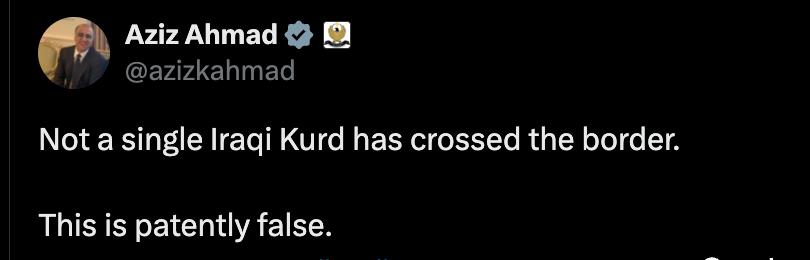 "Ни один иракский курд не пересёк границу. Это совершенно неверно", - написал заместитель руководителя аппарата премьер-министра расположенного в Эрбиле правительства Курдистана Азиз Ахмад.