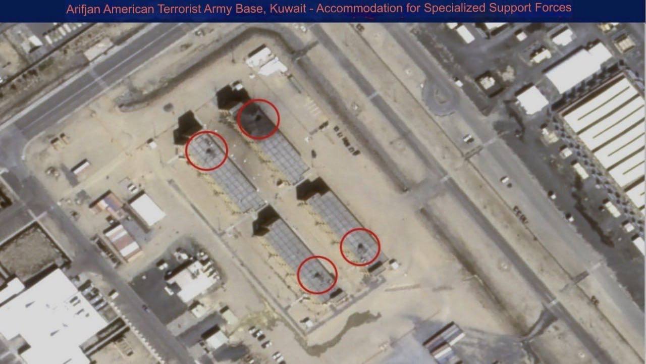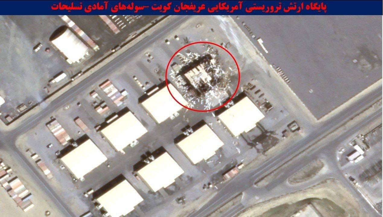 Кроме того, распространяются спутниковые снимки базы Арифджан в Кувейте, на которых видны прилеты по четырем зданиям, складским ангарам и уничтожение антенн спутниковой связи.