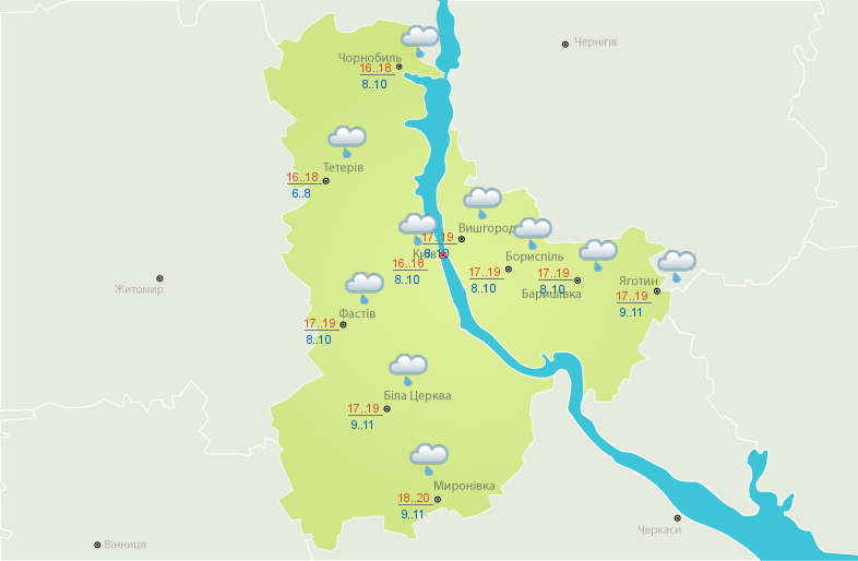 В Белой Церкви днем будет до +19, с утра и до самого вечера сохранится пасмурная погода. В Борисполе также облачно, но без осадков.