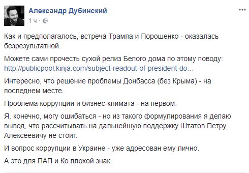 Потом он добавил: "Как и предполагалось, встреча Трампа и Порошенко - оказалась безрезультатной. Интересно, что решение проблемы Донбасса (без Крыма) - на последнем месте. Проблема коррупции и бизнес-климата - на первом. Я, конечно, могу ошибаться - но из такого формулирования я делаю вывод, что рассчитывать на дальнейшую поддержку Штатов Петру Алексеевичу не стоит. И вопрос коррупции в Украине - уже адресован ему лично. А это для ПАП и Ко плохой знак".