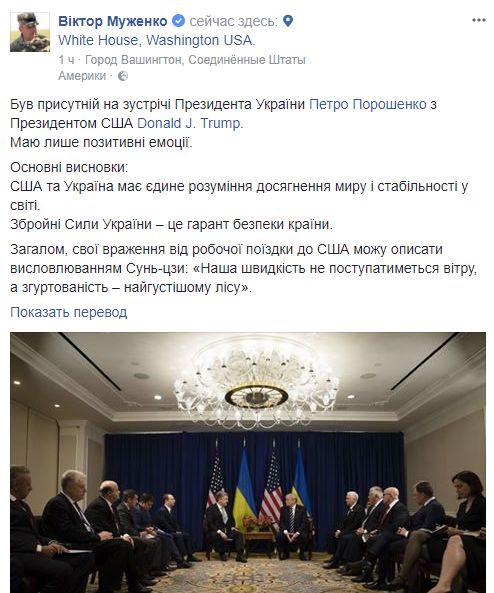 А вот что пишет очевидец встречи - Виктор Муженко, глава Генштаба: "Присутствовал на встрече Президента Украины Петр Порошенко с Президентом США Donald J. Trump. У меня только положительные эмоции.