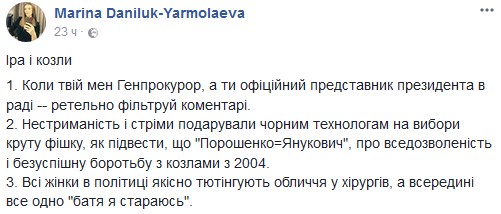 "1. Когда твой мэн Генпрокурор, а ты официальный представитель президента в раде – тщательно фильтруй комментарии. 2. Несдержанность и стримы подарили черным технологам на выборы крутую фишку, как подвести, что "Порошенко=Янукович", о вседозволенности и безуспешной борьбе с козлами из 2004. 3. Все женщины в политике качественно тюнингуют лица у хирургов, а внутри все равно "батя я стараюсь", - написала Данилюк-Ярмолаева.
