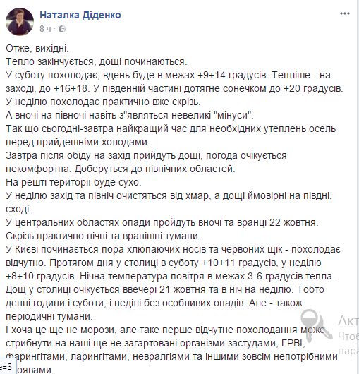 "Дождь в столице ожидается вечером 21 октября и в ночь на воскресенье. То есть дневные часы и субботу, и воскресенье без особых осадков. Но - также периодические туманы", - отметила Диденко.