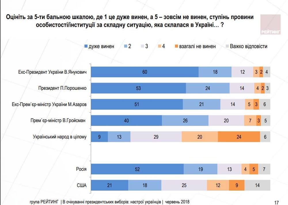 Это опрос в Украине, кто виноват в там бардаке и хаосе, которые сейчас в Украине. Как видите, тут вспоэтмнили и Януковича и Азарова, которых давно нет, перепало и Порошенко с Гройсманом. Не забыли и о России.