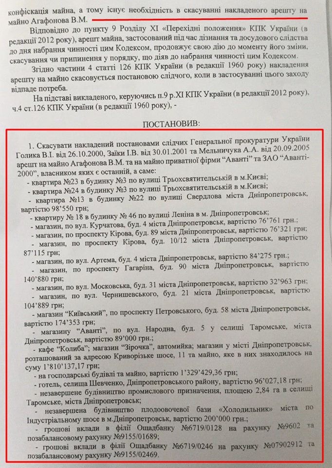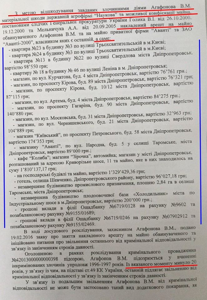 Следствие установило, что к противозаконной деятельности Агафонова, в частности, к незаконному использованию иностранных валютных счетов, был причастен экс-премьер Павел Лазаренко.