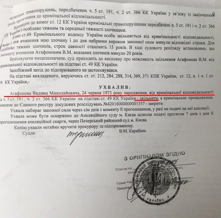 И закончилось оно, как и все у ГОРБАТЮКА - ОСВОБОЖДЕНИЕМ от уголовной ответственности Вадима Агафонова.
