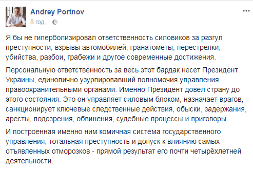 Персональную ответственность за весь этот бардак несет Президент Украины, единолично узурпировавший полномочия управления правоохранительными органами. Именно Президент довёл страну до этого состояния. Это он управляет силовым блоком, назначает врагов, санкционирует ключевые следственные действия, обыски, задержания, аресты, подозрения, обвинения, судебные процессы и приговоры.