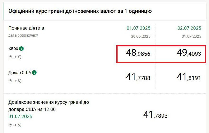 Курс євро продовжує бити рекорди: сьогодні Національний банк підняв свій офіційний курс до нового історичного максимуму – з 48,9856 грн/€ до 49,4093 грн/€ та зафіксував це значення на 2 липня. Підвищення відбулося через новий стрибок курсу євро до долара на світовому ринку із вчорашнього максимуму 1,1751 до сьогоднішнього показника 1,1830.