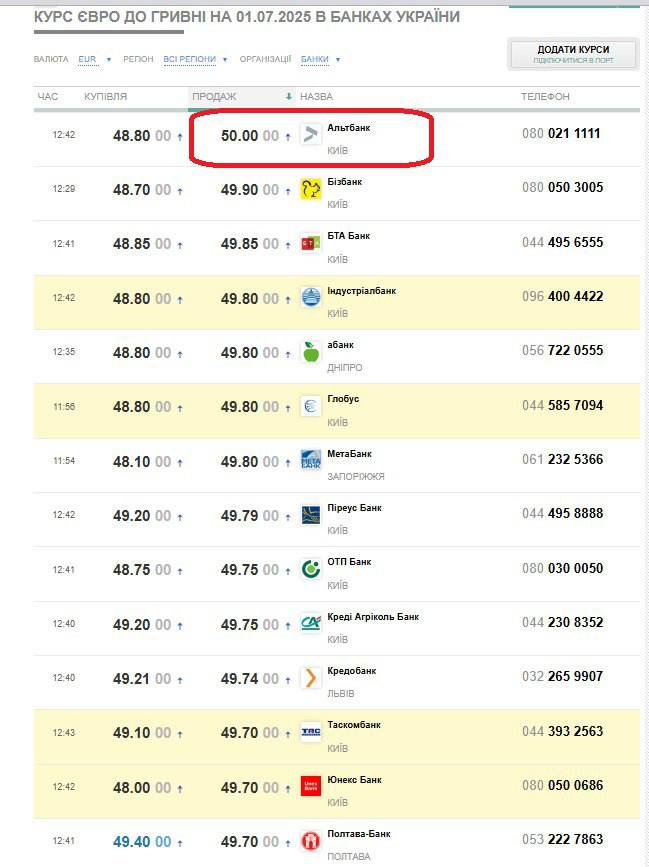 Картковий курс євро на продажі, який дуже важливий для українців, які виїхали до ЄС із гривневими картками, сьогодні сягав 49,75 грн/€ ("Приватбанк") та 49,84 грн/€ ("Райффайзен Банк"). А ціна готівкового євро в касах банків підскочила одразу на 25-30 копійок: середній курс купівлі-продажу становив 48,84-49,64 грн/€, а максимальний вийшов на новий психологічний рівень 50 грн/€ — його поставив "Альтбанк".