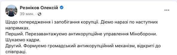 "Щодо попередження та запобігання корупції. Діємо за такими напрямками. Перший. Перезавантажуємо антикорупційне управління Міноборони. Шукаємо кадри. Другий. Формуємо громадський антикорупційний механізм, відкритий для співпраці", - написав міністр.