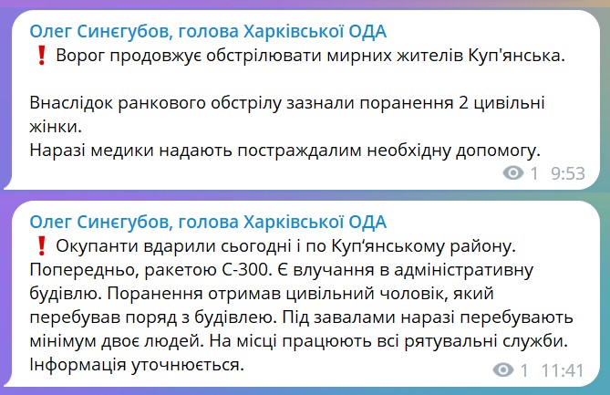 Крім того, Синєгубов повідомив, що вранці війська РФ обстріляли Куп'янськ. Дві жінки зазнали поранень. Медики надають їм необхідну допомогу.