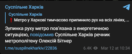 Нагадаємо, 9 березня росіяни завдали 15 ударів по Харкову та області, у місті виникли проблеми зі світлом.