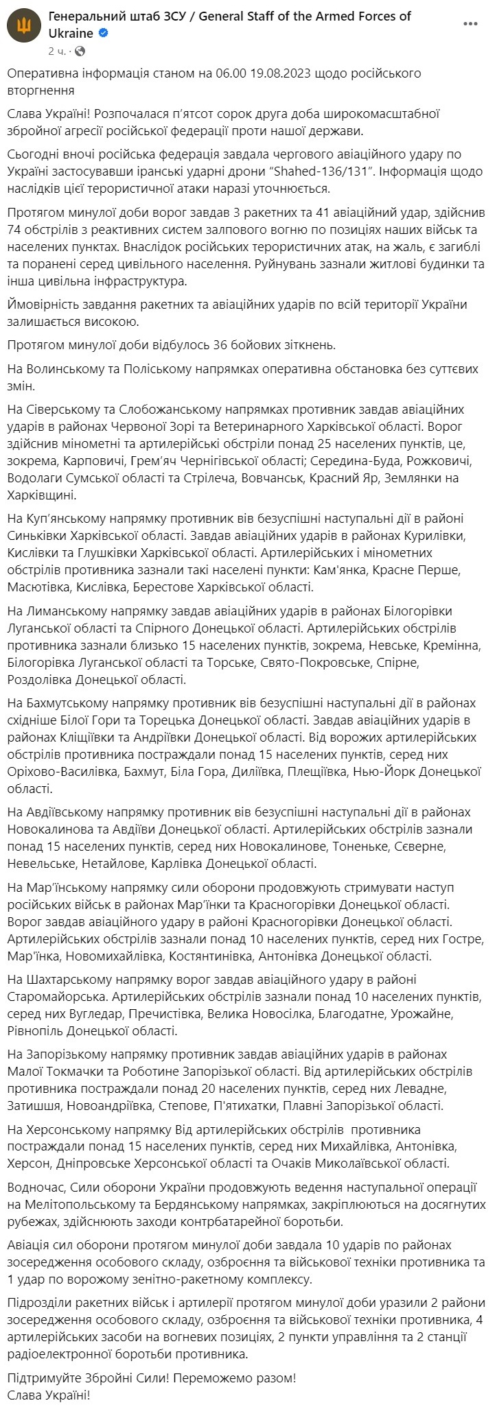 Минулої доби Росія завдала 3 ракетних і 41 авіаційного удару, здійснила 74 обстріли з реактивних систем залпового вогню за позиціями наших військ і населеними пунктами. Минулої доби сталося 36 бойових зіткнень.