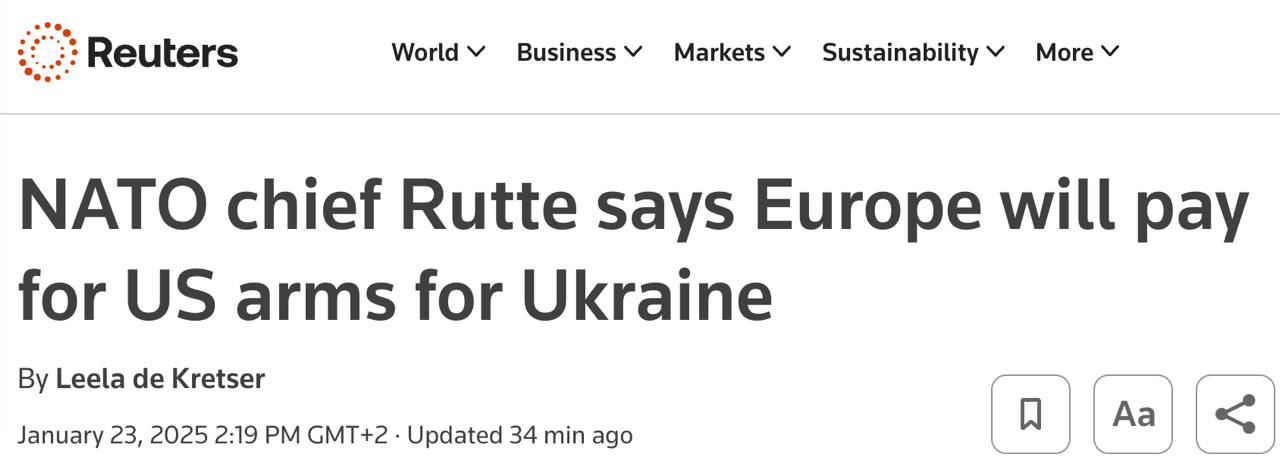 "Що стосується України, нам також необхідно, щоб США продовжували брати участь у цьому процесі. Якщо ця нова адміністрація Трампа готова продовжувати постачати Україну зі своєї оборонно-промислової бази, то рахунок сплатять європейці, я в цьому абсолютно переконаний, ми маємо бути готові це зробити ", - сказав Рютте.