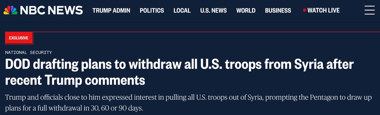 Міністерство оборони США розробляє план виведення всіх американських військ із Сирії за 30-90 днів.