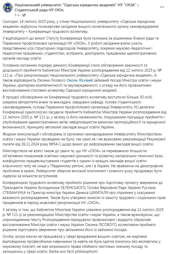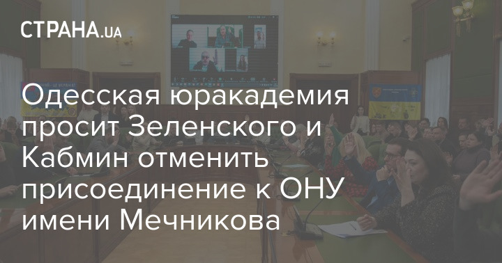 Національний університет "Одеська юридична академія" закликала Володимира Зеленського та Кабінет міністрів скасувати розпорядження про її приєднання до Одеського національного університету ім. І. Мечникова і вимагала відставки міністра освіти Оксена Лісового.
