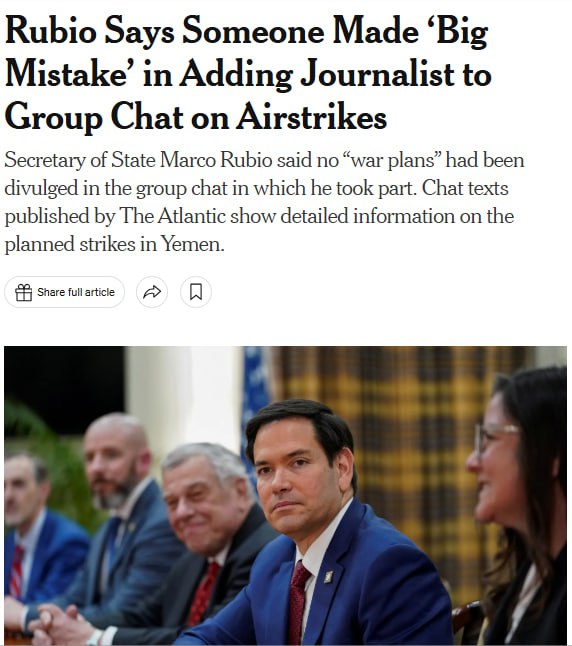 Глава Держдепу заявив, що чат був створений з метою координації між головними помічниками Дональда Трампа із зовнішньої політики, щоб вони могли проінформувати своїх колег в інших країнах та американських чиновників про удари, коли настане слушний момент для цього. Він додав, що інформація "не призначалася для розголошення" громадськості, і "це була помилка, якою не мало бути, і Білий дім вивчає її".