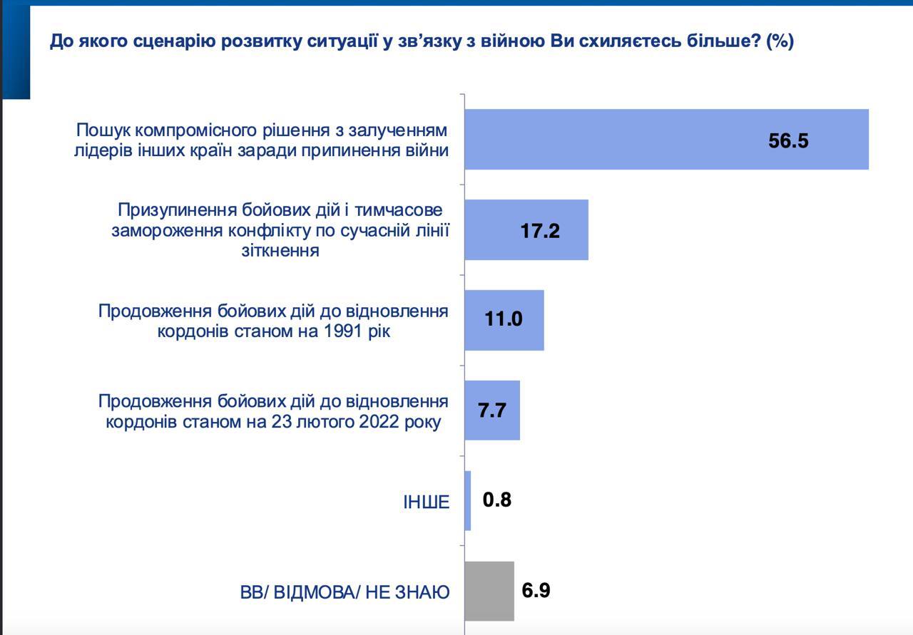 На запитання: "До якого сценарію розвитку ситуації у зв'язку з війною ви більше схиляєтеся?" - 56,5% відповіли: "Пошук компромісного рішення із залученням лідерів інших країн заради припинення війни".