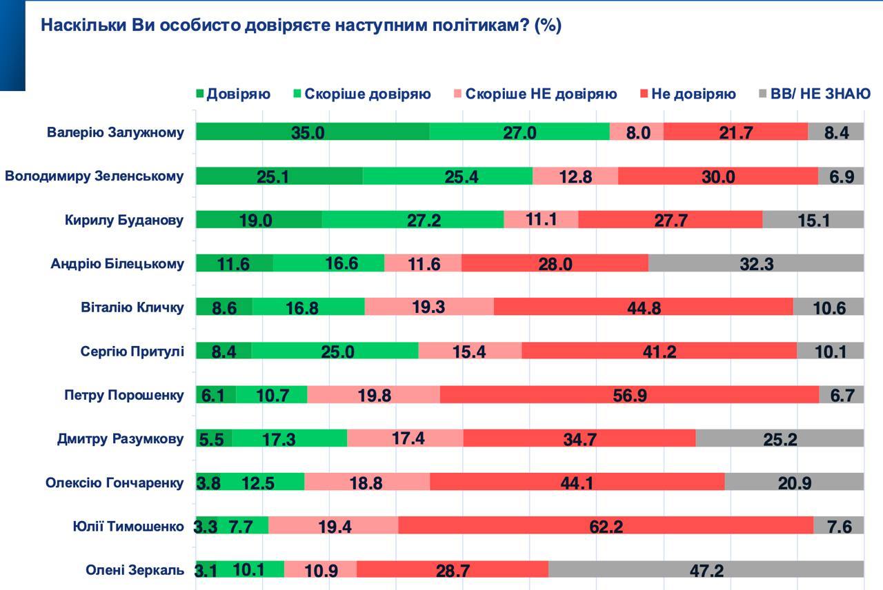 При цьому лідером довіри українців є екс-главком Валерій Залужний – йому так чи інакше довіряють 62%.