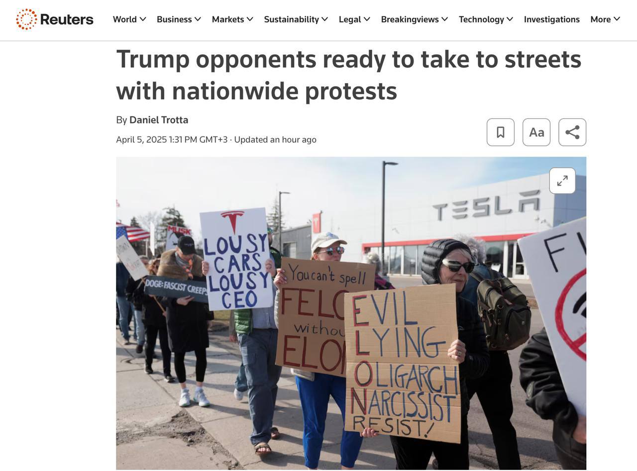 За очікуваннями організаторів, мітинги стануть "найбільшим днем протесту проти президента Дональда Трампа та його союзника-мільярдера Ілона Маска з тих пір, як адміністрація розпочала свої стрімкі зусилля щодо накладення консервативного штампу на уряд".