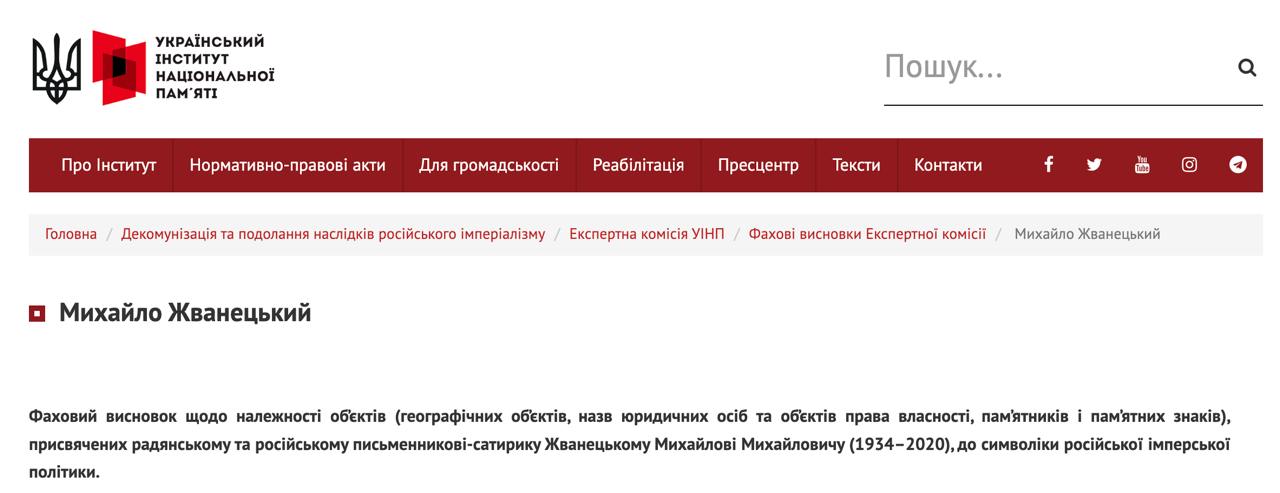 В УІНП резюмували, що ім'я Жванецького в назвах вулиць та інших топонімах є пропагандою російської імперської політики.