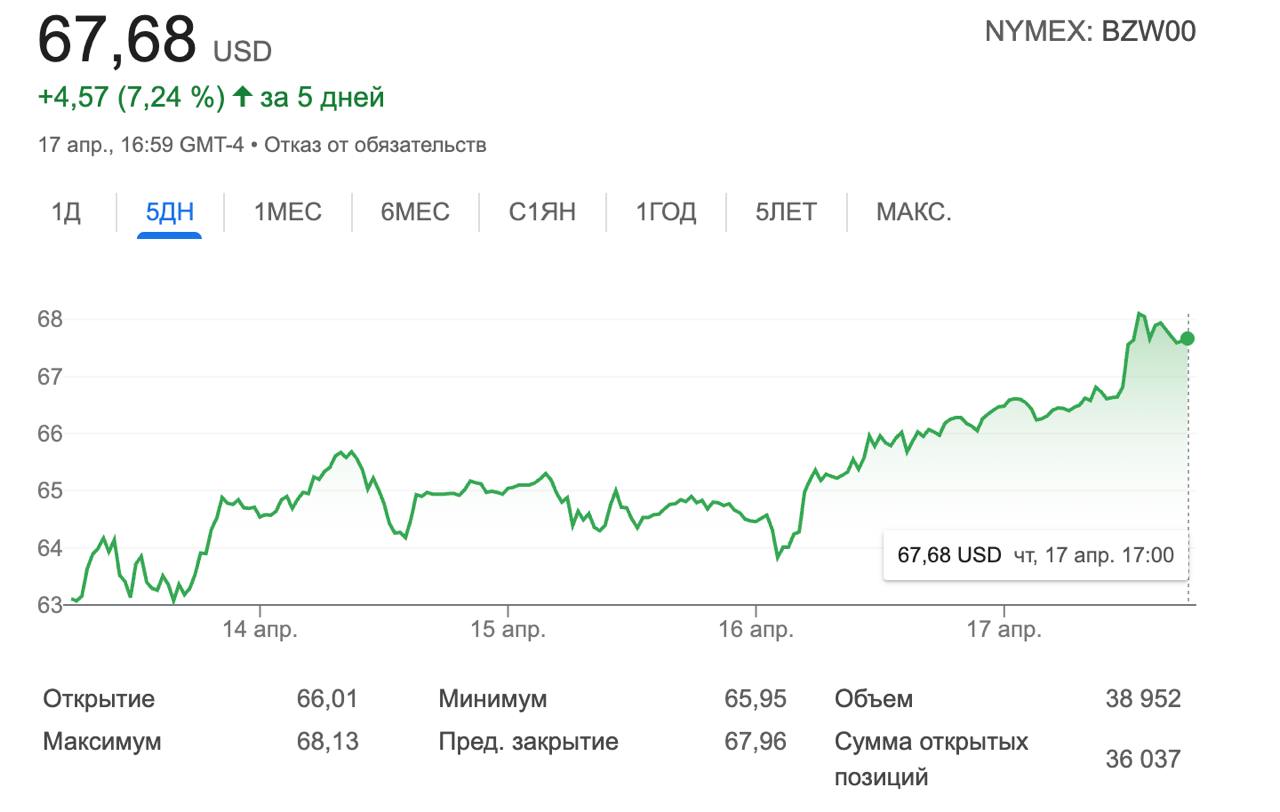 Марка Brent подорожчала на 7% за останні 5 днів і коштує понад 67 дол. за барель. WTI – на 3% до 67,9 дол.