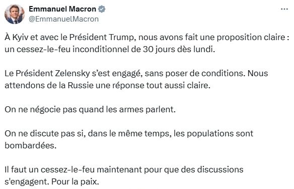 "Президент України Володимир Зеленський взяв на себе зобов'язання, не ставлячи жодних умов. Тепер ми очікуємо на таку ж чітку відповідь від Росії. Не може бути переговорів, коли каже зброя. Не може бути діалогу, коли в той же час бомбардують мирних жителів. Зараз потрібно припинення вогню, щоб переговори могли розпочатися", - написав Макрон.