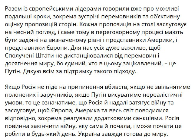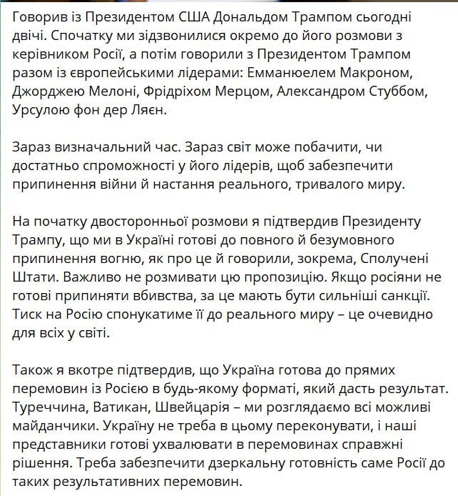 "На початку двосторонньої розмови я підтвердив президенту Трампу, що ми в Україні готові до повного і безумовного припинення вогню, як про це і говорили, зокрема, Сполучені Штати. Важливо не розмивати цю пропозицію. Якщо росіяни не готові припиняти вбивства, за це повинні бути сильніші санкції. Очевидно для всіх. Також я ще раз підтвердив, що Україна готова до прямих переговорів з Росією в будь-якому форматі, який дасть результат. Туреччина, Ватикан, Швейцарія – ми розглядаємо всі можливі майданчики.
