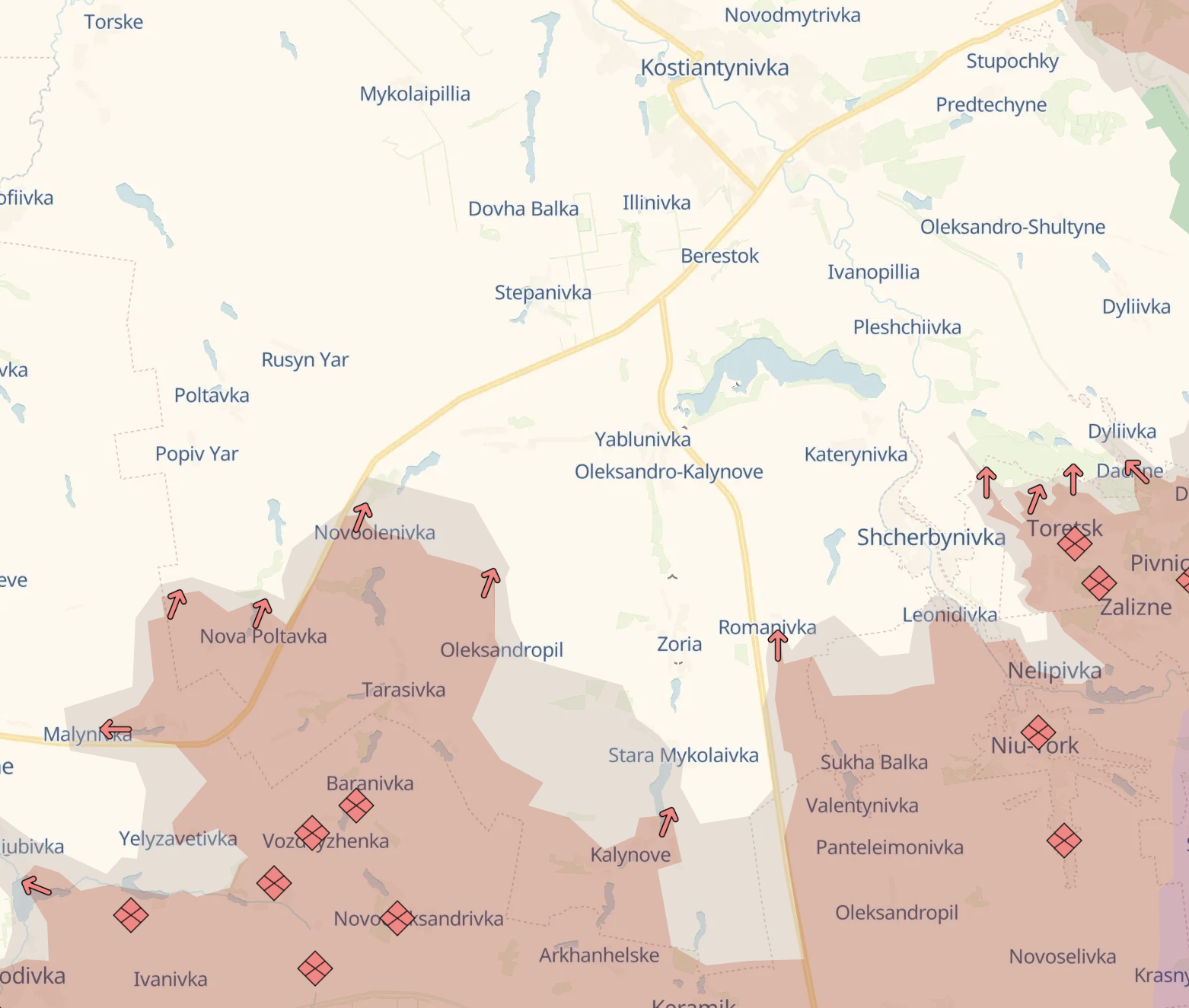Основна подія на трасі Покровськ – Костянтинівка – прорив російських сил до Нової Полтавки, яку, за даними низки українських оглядачів, РФ уже захопила. Це село на північ від дороги до Костянтинівки. Напередодні росіяни фактично зайняли два сусідні села - Малинівку та Новоєленівку.