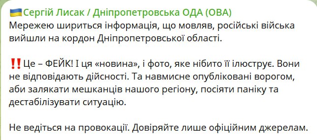 У свою чергу, голова Дніпропетровської обласної військової адміністрації Сергій Лисак спростував повідомлення російських пабліків про те, що війська РФ вийшли на кордон Донецької та Дніпропетровської областей.
