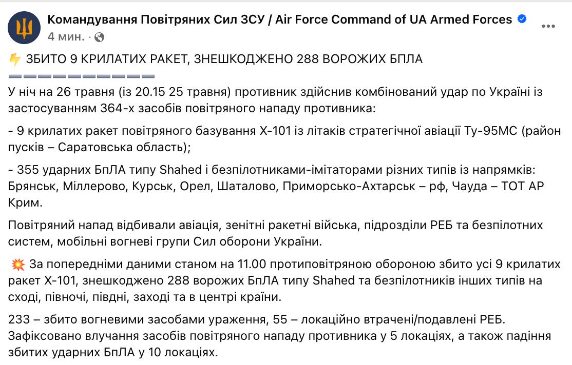 За попередніми даними, протиповітряною обороною збито всі 9 крилатих ракет Х-101, знешкоджено 288 ворожих БПЛА типу Shahed та безпілотників інших типів на сході, півночі, півдні, заході та в центрі країни.