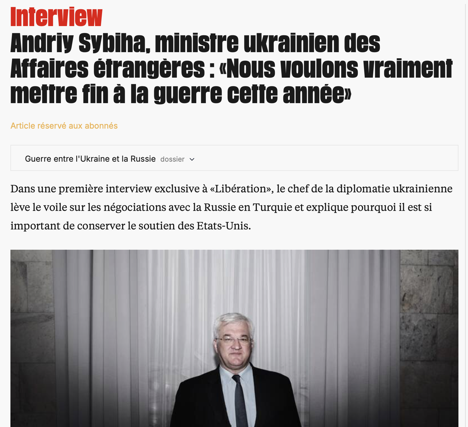 Про це заявив глава Міністерства закордонних справ Андрій Сибіга під час інтерв'ю Libaration.