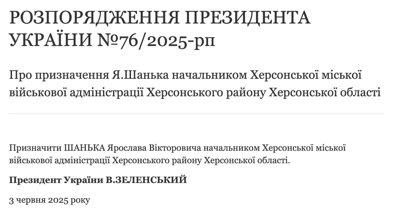 "Призначити Шанька Ярослава Вікторовича головою Херсонської міської військової адміністрації Херсонського району Херсонської області", - йдеться у документі.