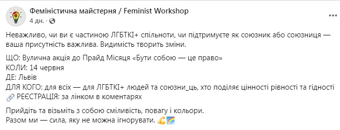Тим часом на початку тижня ЛГБТ-спільнота анонсувала у Львові 14 червня масовий захід "Бути собою – це право". Його проводять з нагоди місяця прайду – щорічного червневого святкування гордості ЛГБТК+, яке вшановує внесок лесбіянок, геїв, бісексуалів, трансгендерів та квірів у культуру та спільноту.