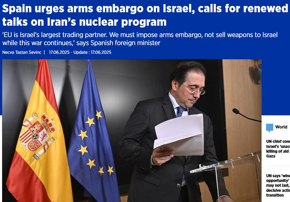 Глава МЗС Іспанії Хосе Мануель Альбарес закликає Європейський Союз запровадити обмеження на постачання озброєнь ізраїльській армії.