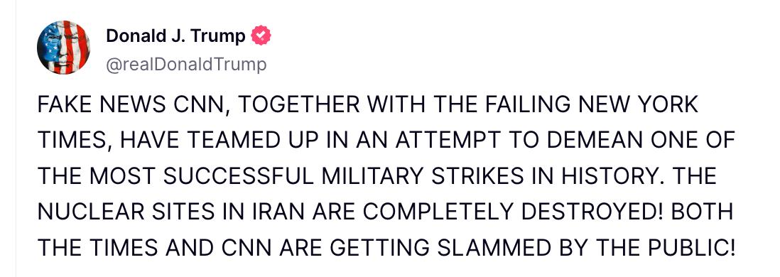 "Фейкові новини CNN разом із перебуваючої в занепадi New York Times об'єдналися, намагаючись принизити одну з найуспішніших військових операцій в історії. Ядерні об'єкти в Ірані повністю знищені. І Times, і CNN отримують шквал критики від громадськості", - написав президент США у своїй соцмережі Truth Social.