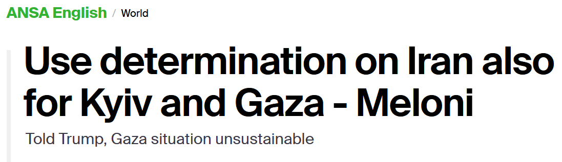 "Я сказала президенту Дональду Трампу і сказала на саміті, що така ж рішучість щодо війни між Ізраїлем та Іраном повинна бути виявлена і за двома іншими угодами про припинення вогню – для України та для Гази", – заявила Мелоні після саміту НАТО в Гаазі.