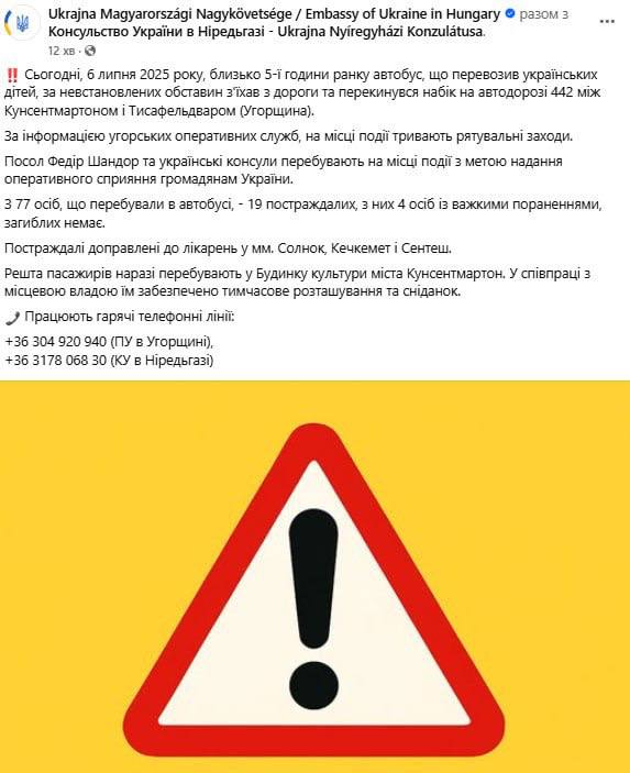 "На місці події продовжуються рятувальні заходи. Посол Федір Шандор та українські консули перебувають на місці події з метою оперативного сприяння громадянам України", - йдеться в повідомленні.
