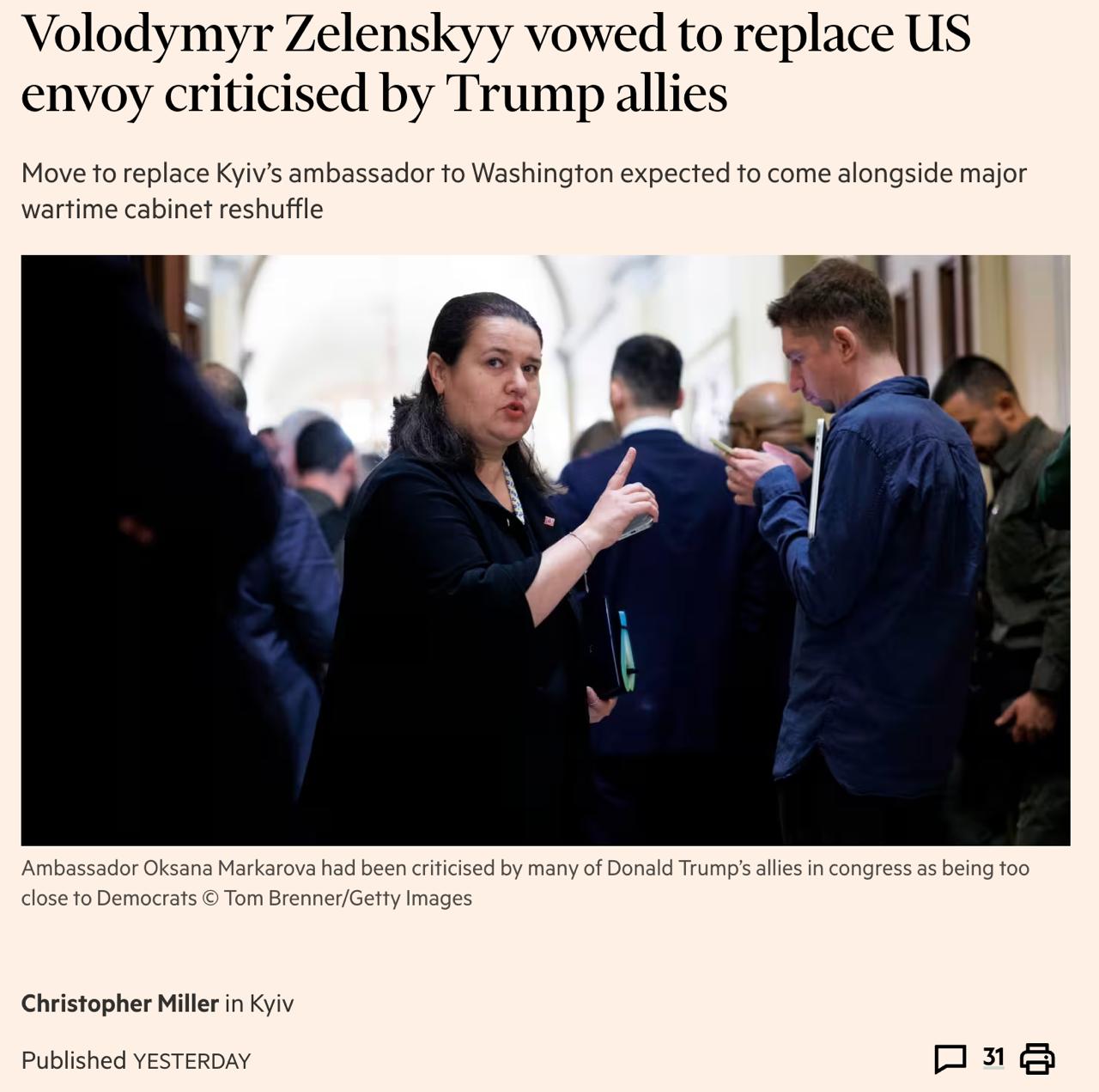 За їхніми даними, Володимир Зеленський пообіцяв президенту США Дональду Трампу замінити посла Оксану Маркарову, яку республіканці критикують за близькість до Демократичної партії. Президенти домовилися, що їхні команди окремо обговорять кандидатів на заміну. Зеленський розраховує призначити послом " людини, яка вміє укладати угоди", яка "буде зрозуміла Білому дому і в той же час конгресу", заявив високопоставлений український чиновник газеті.