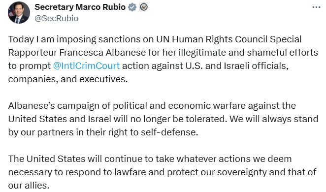 Держсекретар США Марко Рубіо оголосив про запровадження санкцій проти спецдоповідача Ради з прав людини ООН Франческі Альбанезе.