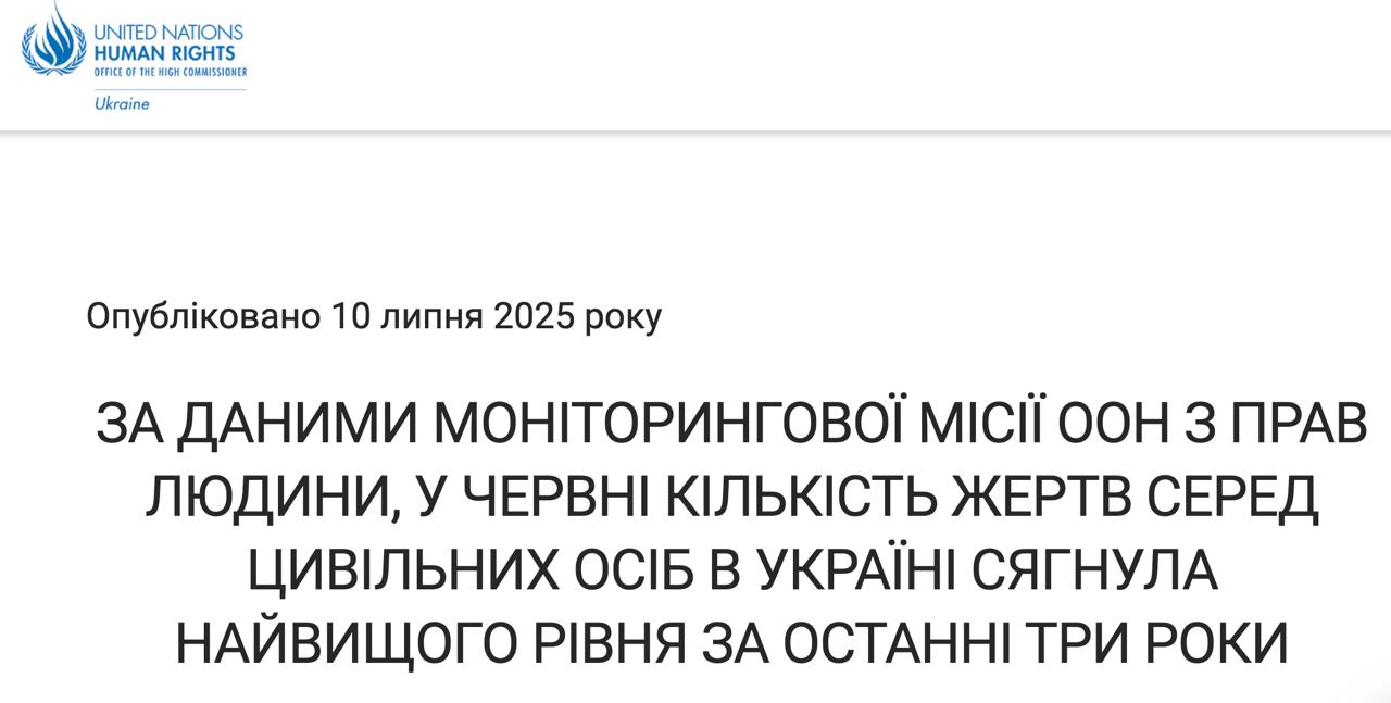 За червень в Україні через війну загинули найбільше цивільних за три роки - звіт ООН