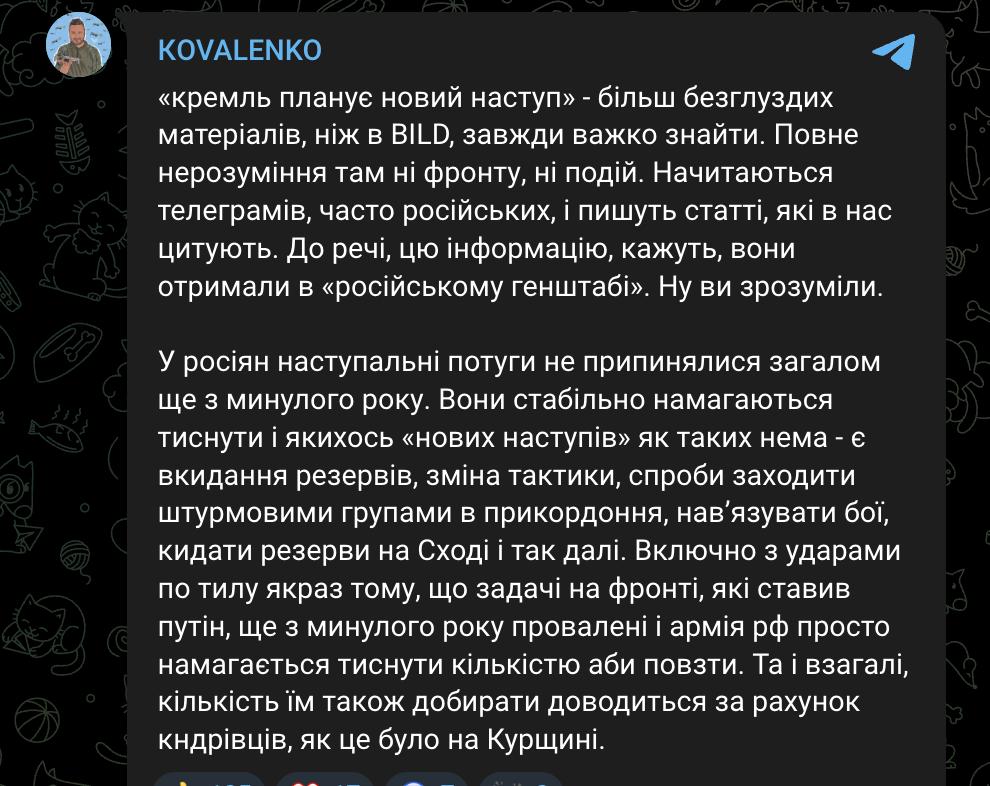 "У росіян наступальні дії, загалом, не припинялися ще з минулого року. Вони стабільно намагаються тиснути, і жодних "нових наступів" як таких немає - є перекидання резервів, зміна тактики, спроби заходити штурмовими групами на прикордонні, нав'язувати бої, кидати підкріплення на Схід", - заявив голова ЦПД Андрій Коваленко.